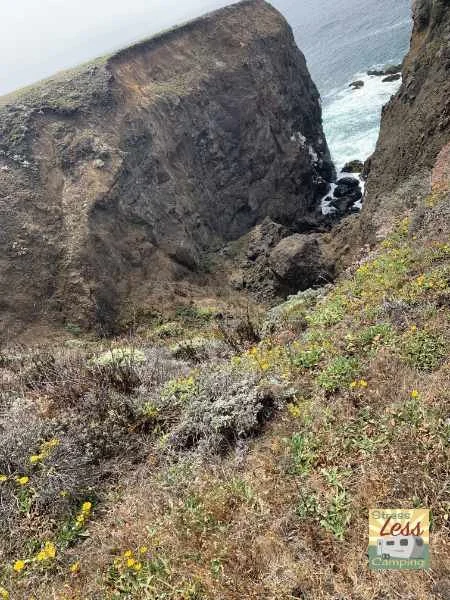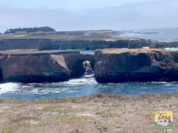 The Mendocino Coast is relatively young and is still actively forming. Landforms such as sea caves, stacks, and arches are common. When the roof of a sea cave falls, a bowl-shaped formation results. Other portions of the coast have rocks that look like bowling balls and gargoyles! Additionally, marine terraces reveal evidence of the history of uplift and erosion.