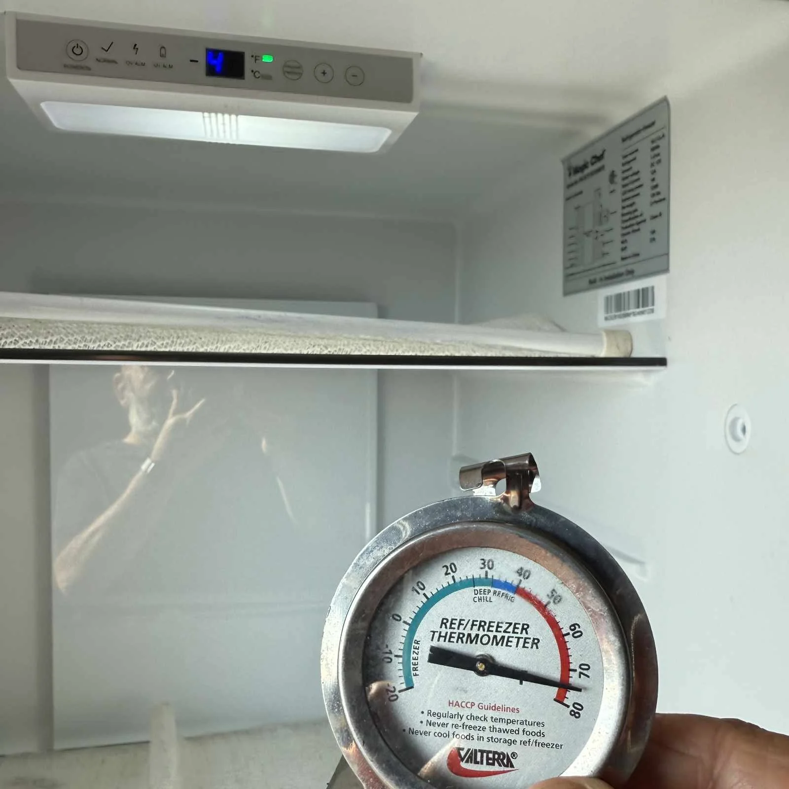 The initial temperature reading of the fridge with our dial fridge thermometer.