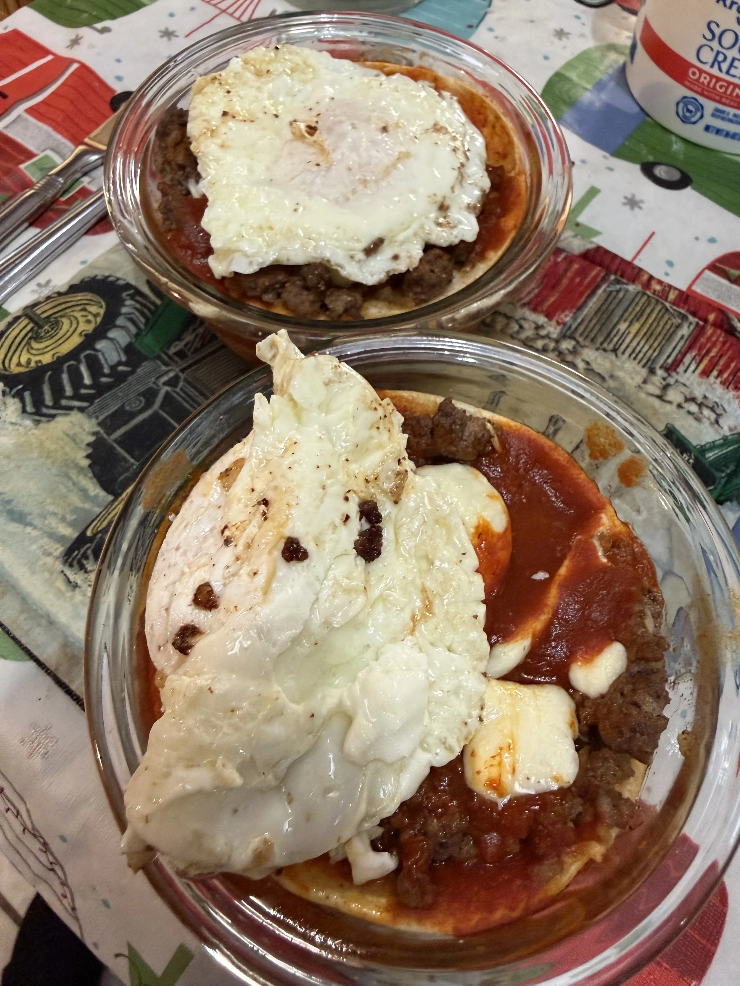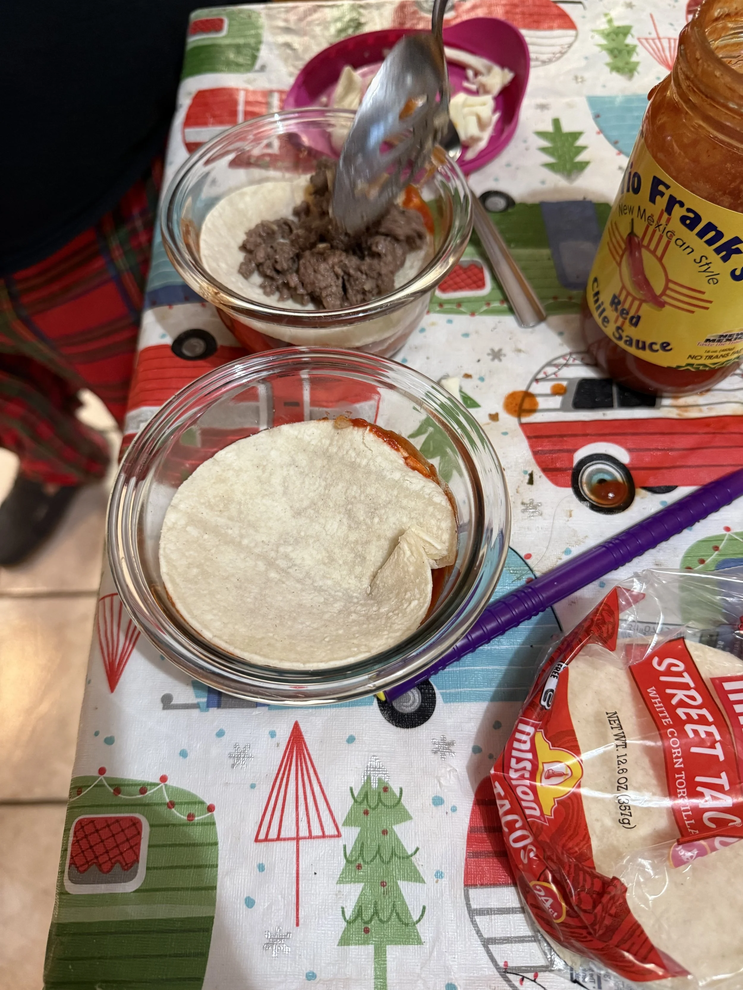 The photos I’m including in this post are from my (successful) attempt at making individual servings of stacked enchiladas. I used two of our Pyrex dishes. Perhaps I have to say vintage Pyrex or something; I cannot find our syle of dishes on the website. Anyway, any oven-safe container will do. If you have something approximately tortilla-sized, go for it. Otherwise, get out that 9X13 and make a whole pan. You’ll want that much anyway!