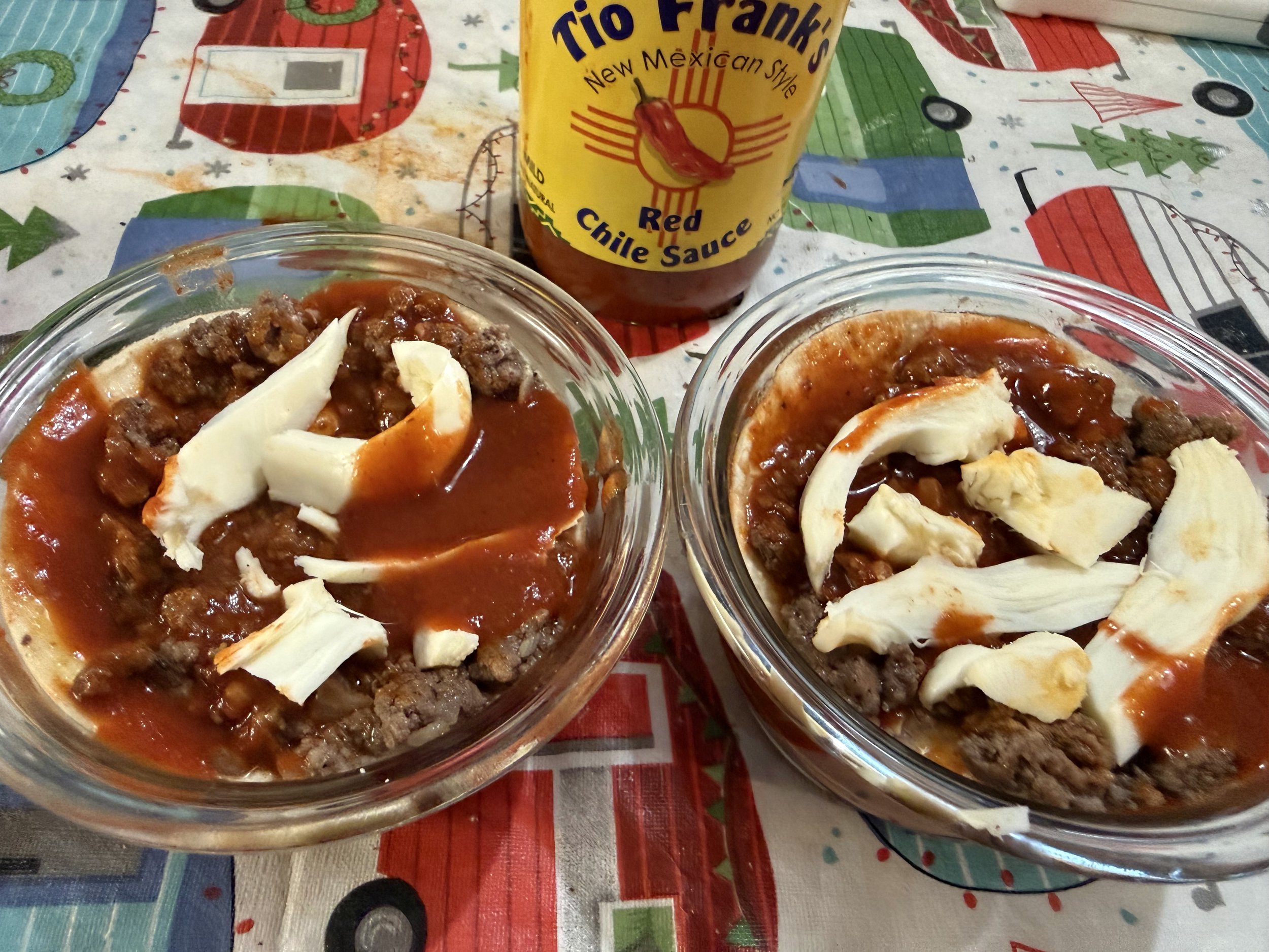 While we were shopping at the Holiday Market at the Albuquerque Rail Yards, Tony picked up a jar of Tio Frank’s Red Chili Sauce. He get a chance to taste-test the sauce at Tio Frank’s booth, and declared it to be perfect for enchiladas.
