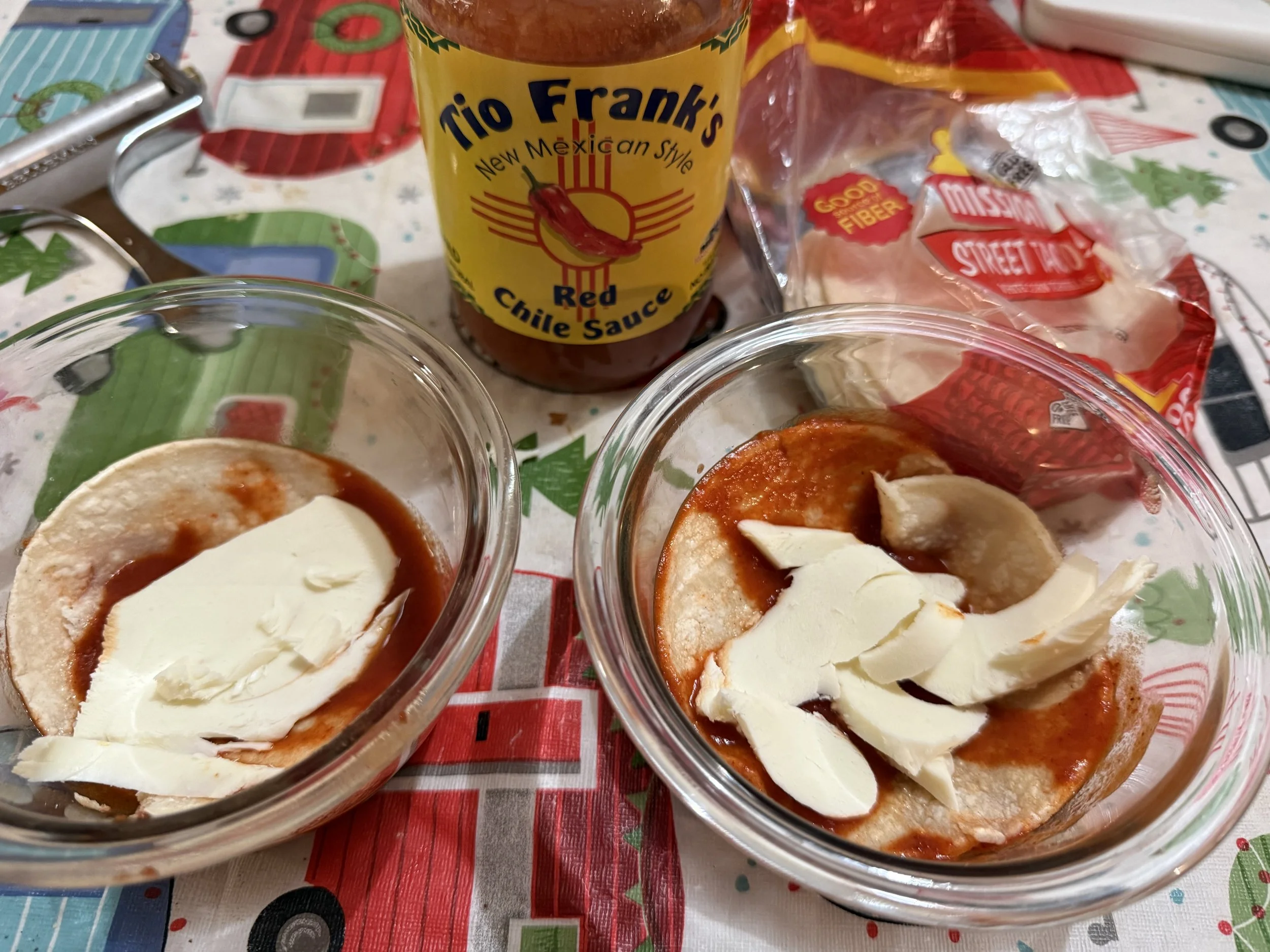 OK, anyway. Here we go. Stacked enchiladas. This is another New Mexico signature dish that I’ve really embraced. Because we love enchiladas, but not all the work and frustration that goes into making them. So, when Tony tasted Tio Frank’s sauce (remember Tio Frank’s? From the top of this page?) and said he wanted enchiladas, I was completely on-board.
