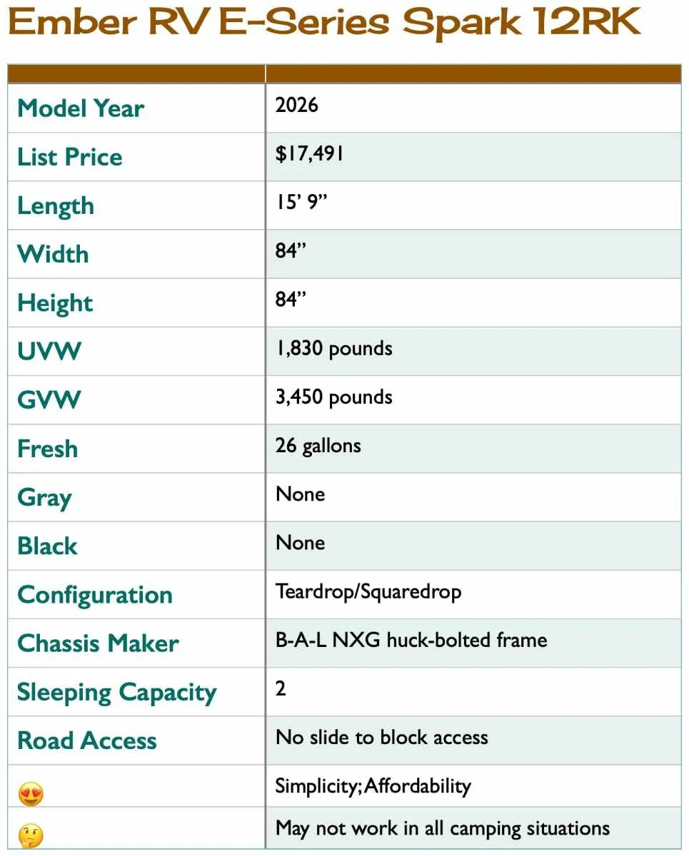 Today’s RV review is of the new-for-2026 Ember RV E-SeriesSpark 12RK. Essentially this is a “square drop” or a teardrop-style layout in a more squared-off package. I saw this at its debut at the Overland Expo West where there were a big number of this style of rig but this one had a clear difference from those - it was far less expensive.