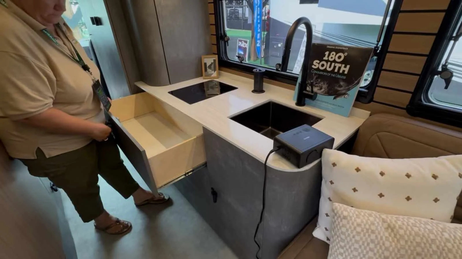 There is no slide in this rig which is fine. On the camp side is a counter with a single-burner induction cooktop and a sink. There’s a microwave above that in a cabinet. On the subject of cabinets, there are a decent number of those and drawers so storage is fine, especially for a Class B RV.