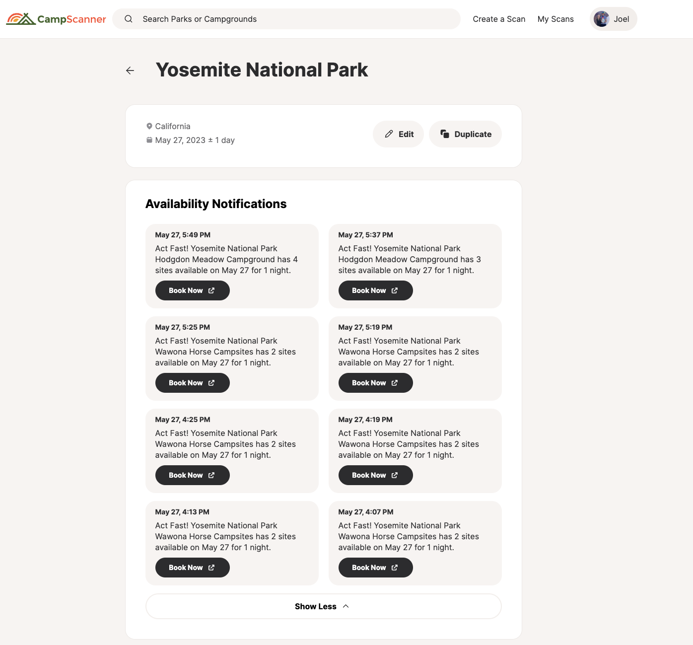 Screen shots from Joel’s computer where he was able to make reservations even on a holiday weekend with CampScanner. Nice!